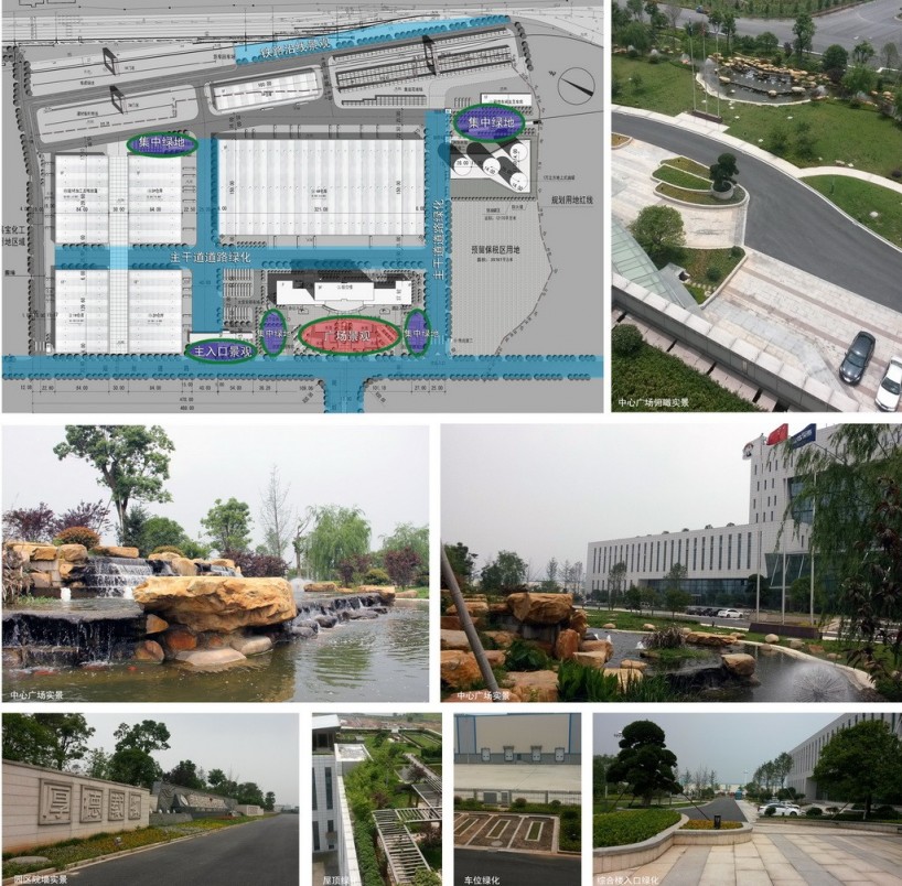 面:重點打造綜合樓入口中心廣場的景觀,高達一萬多平米的集中園林綠化為物流園區提供了清新的綠肺,作為園區核心風貌景觀區與綜合樓相映成趣,提升了園區的整體景觀品質,也為園區物流人員提供了一個輕松交流、親近自然的休閑場所。除了中心廣場,我們還充分利用綜合樓的南北兩側裙房做了大面積的屋頂綠化,為五樓的辦公人員創建了舒心宜人的空中花園,兼具環保功能與景觀效益。在多層次的立體綠化園林襯托下,整個嘉寶物流基地顯得流光溢彩,生意盎然(圖17)。
