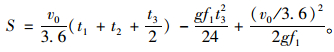式中,v0為汽車運行速度;f1為縱向摩阻系數(shù),依車速及路面狀況而定;g為重力加速度(9.8 m/s2);t1為駕駛者反應(yīng)時間,取2.5 s(判斷時間1.5 s,運行時間1.0 s)。